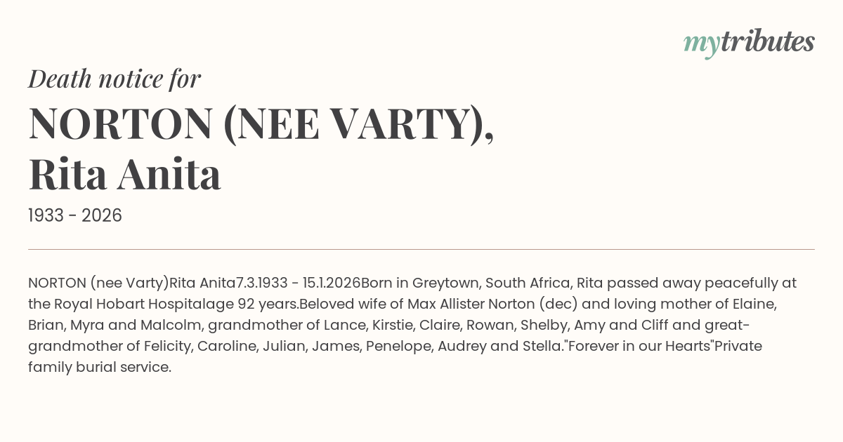 Beloved wife of Max Allister Norton (dec) and loving mother of Elaine, Brian, Myra and Malcolm, grandmother of Lance, Kirstie, Claire, Rowan, Shelby, Amy and Cliff and great-grandmother of Felicity, Caroline, Julian, James, Penelope, Audrey and Stella.