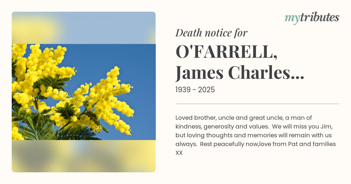 16°CLoved brother, uncle and great uncle, a man of kindness, generosity and values. We will miss you Jim, but loving thoughts and memories will remain with us always.