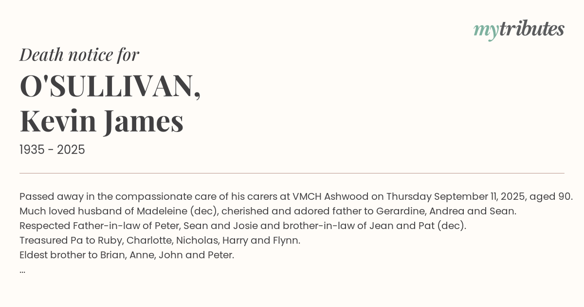 16°CPassed away in the compassionate care of his carers at VMCH Ashwood on Thursday September 11, 2025, aged 90.
