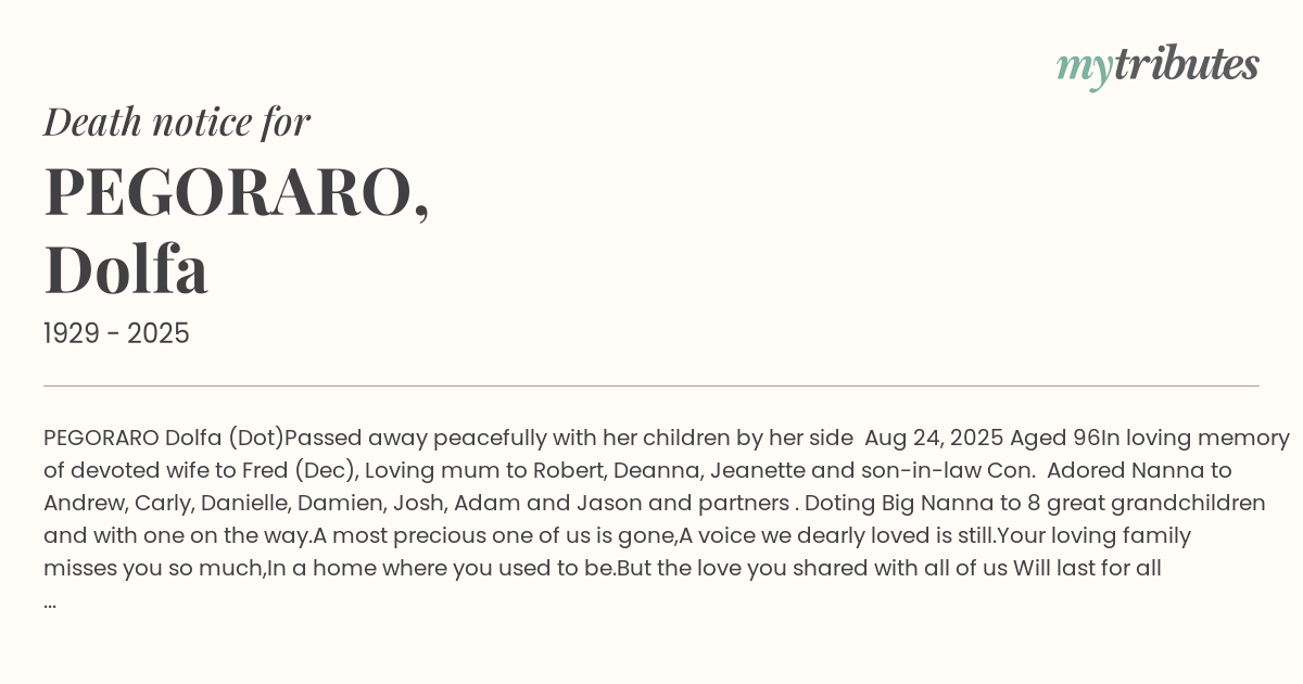 Passed away peacefully with her children by her side Aug 24, 2025 Aged 96