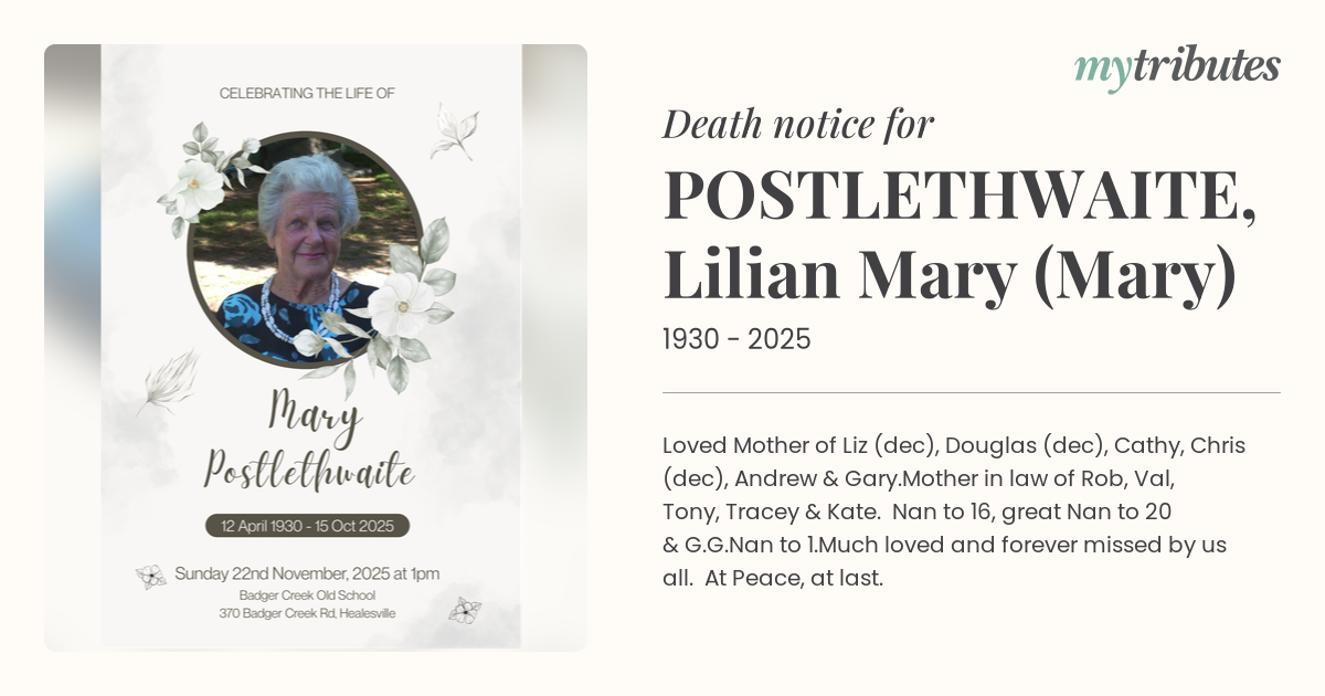 16°CLoved Mother of Liz (dec), Douglas (dec), Cathy, Chris (dec), Andrew & Gary.Mother in law of Rob, Val, Tony, Tracey & Kate. Nan to 16, great Nan to 20 & G.G.Nan to 1.