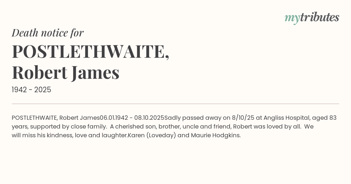Sadly passed away on 8/10/25 at Angliss Hospital, aged 83 years, supported by close family. A cherished son, brother, uncle and friend, Robert was loved by all.