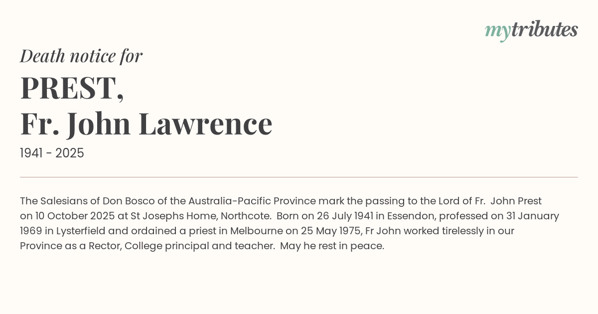 16°CThe Salesians of Don Bosco of the Australia-Pacific Province mark the passing to the Lord of Fr. John Prest on 10 October 2025 at St Joseph’s Home, Northcote. Born on 26 July 1941 in Essendon, professed on 31 January 1969 in Lysterfield and ordained a priest in Melbourne on 25 May 1975, Fr John worked tirelessly in our Province as a Rector, College principal and teacher. May he rest in peace.