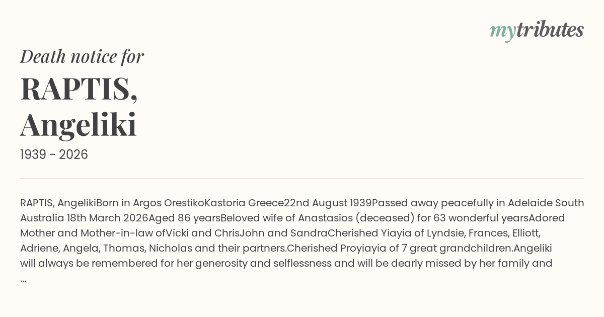 Angeliki will always be remembered for her generosity and selflessness and will be dearly missed by her family and friends.