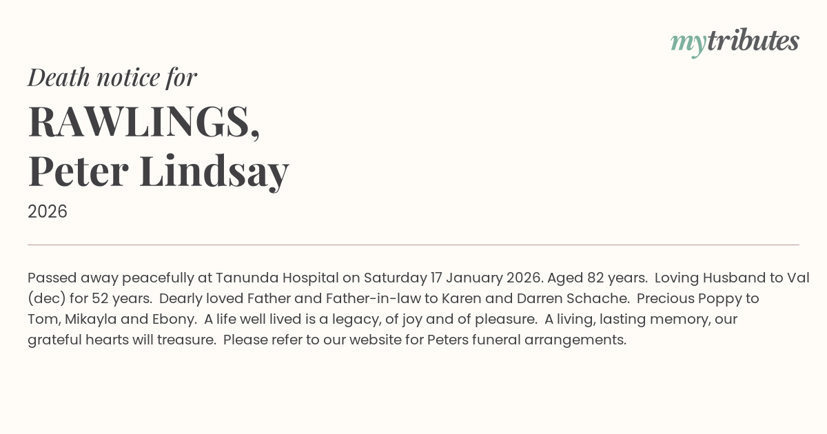 16°CPassed away peacefully at Tanunda Hospital on Saturday 17 January 2026.