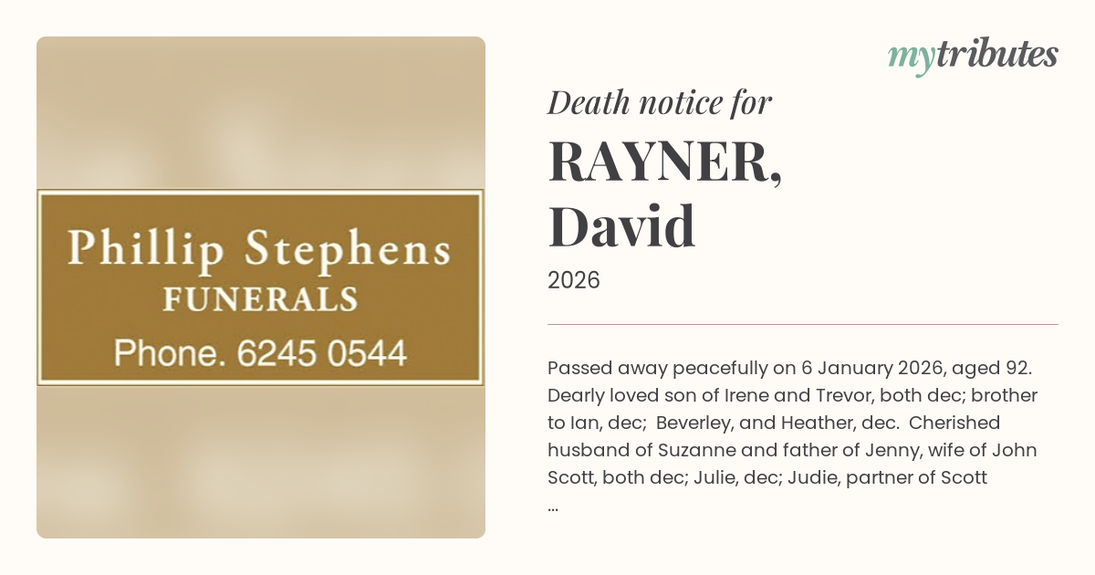 16°CPassed away peacefully on 6 January 2026, aged 92. Dearly loved son of Irene and Trevor, both dec; brother to Ian, dec; Beverley, and Heather, dec. Cherished husband of Suzanne and father of Jenny, wife of John Scott, both dec; Julie, dec; Judie, partner of Scott and Andrew.