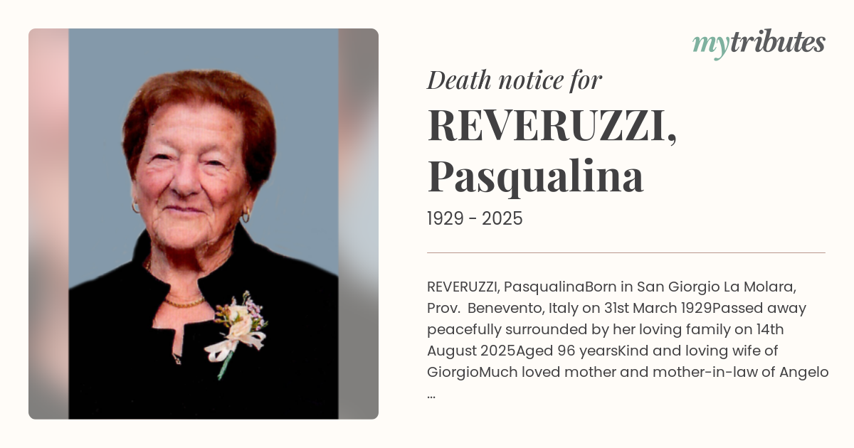 Much loved mother and mother-in-law of Angelo (dec) and Luisa (dec), Joe and Marisa