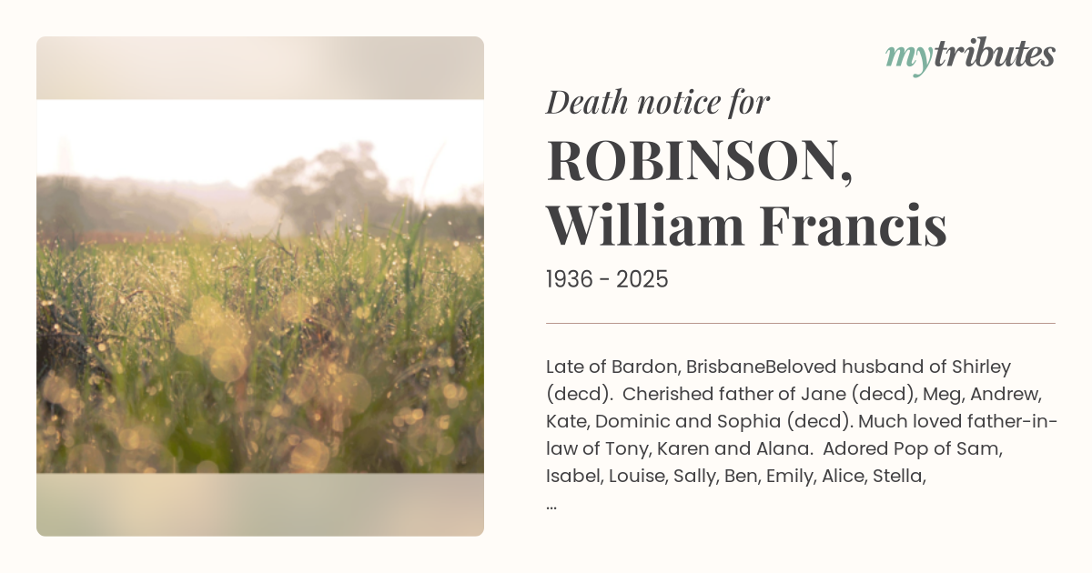 Beloved husband of Shirley (dec’d). Cherished father of Jane (dec’d), Meg, Andrew, Kate, Dominic and Sophia (dec’d). Much loved father-in-law of Tony, Karen and Alana. Adored Pop of Sam, Isabel, Louise, Sally, Ben, Emily, Alice, Stella, Annabelle, Joseph, William, Declan and Elliott. Loved great grandfather to Phoebe