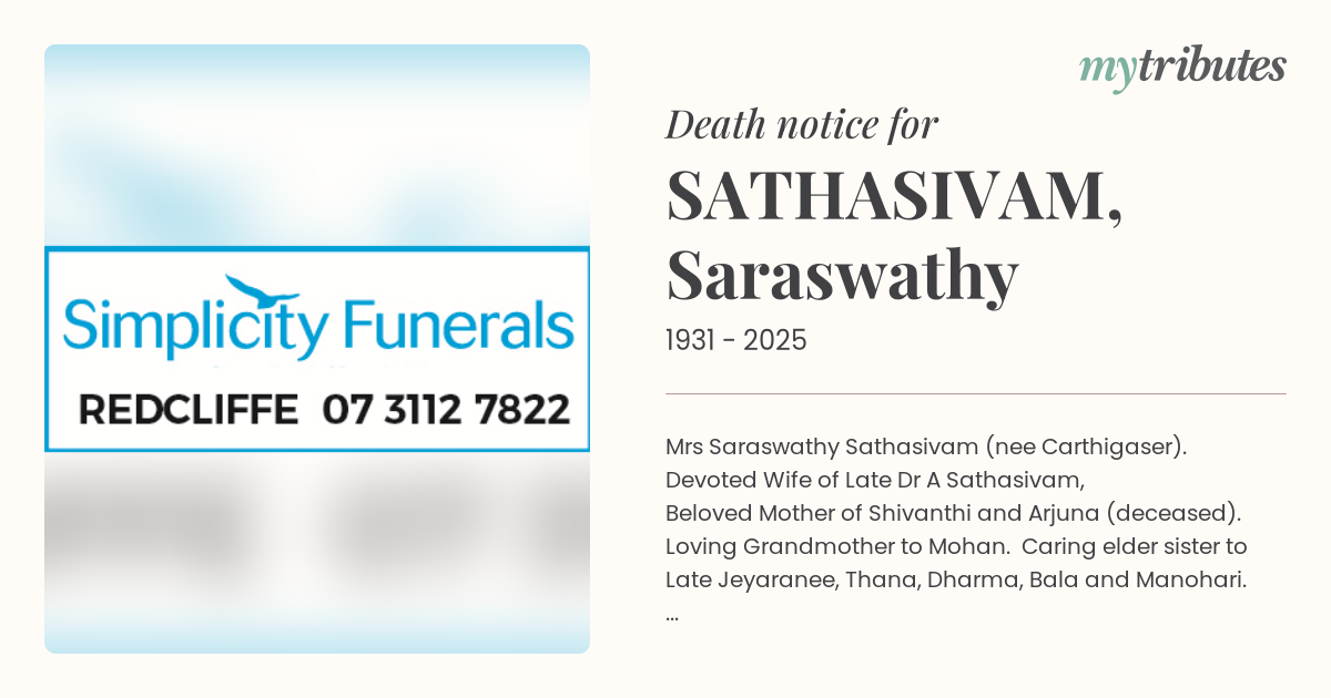 Loving Grandmother to Mohan. Caring elder sister to Late Jeyaranee, Thana, Dharma, Bala and Manohari.