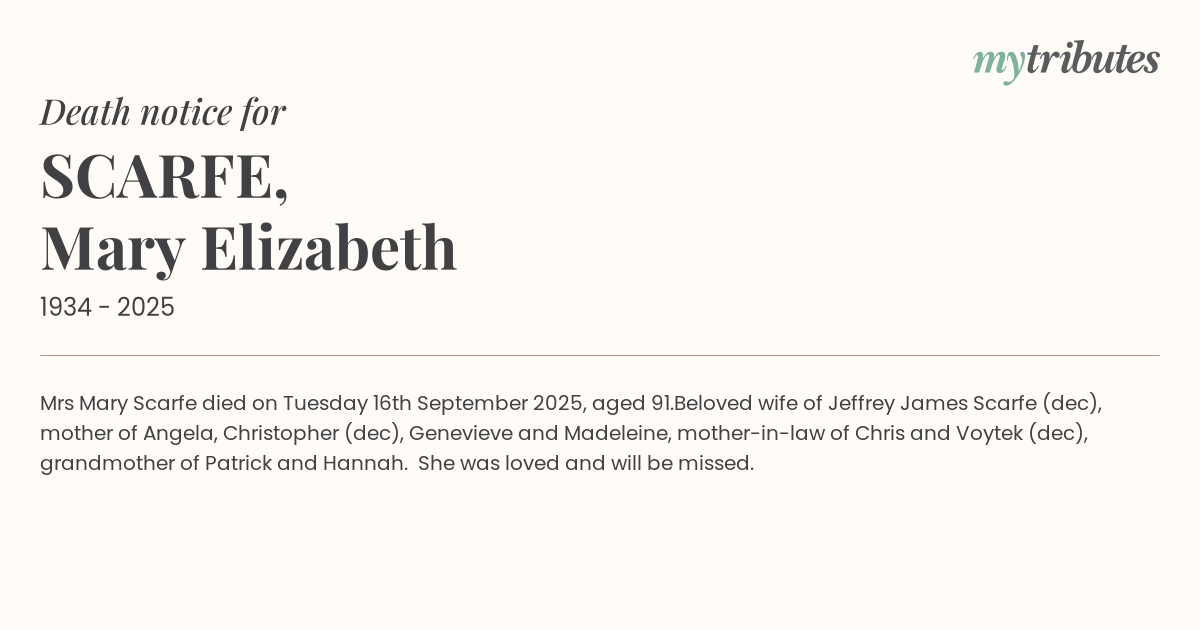 16°CMrs Mary Scarfe died on Tuesday 16th September 2025, aged 91.