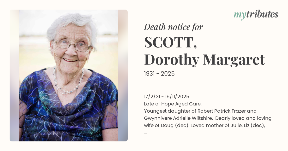 Youngest daughter of Robert Patrick Frazer and Gwynnivere Adrielle Wiltshire. Dearly loved and loving wife of Doug (dec). Loved mother of Julie, Liz (dec), Rob (dec), Jane, Mark, Gerard, Peter, Andrew, Kerrie, Shaun and their partners. Grandmother of 31, Great-grandmother of 21.