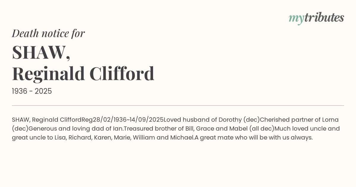 Much loved uncle and great uncle to Lisa, Richard, Karen, Marie, William and Michael.