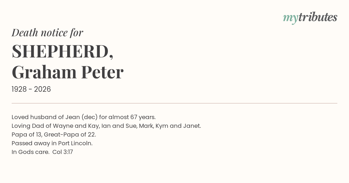 16°CLoved husband of Jean (dec) for almost 67 years.