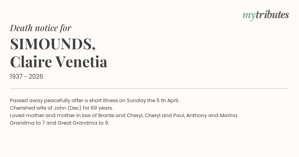 16°CPassed away peacefully after a short illness on Sunday the 5 th April.