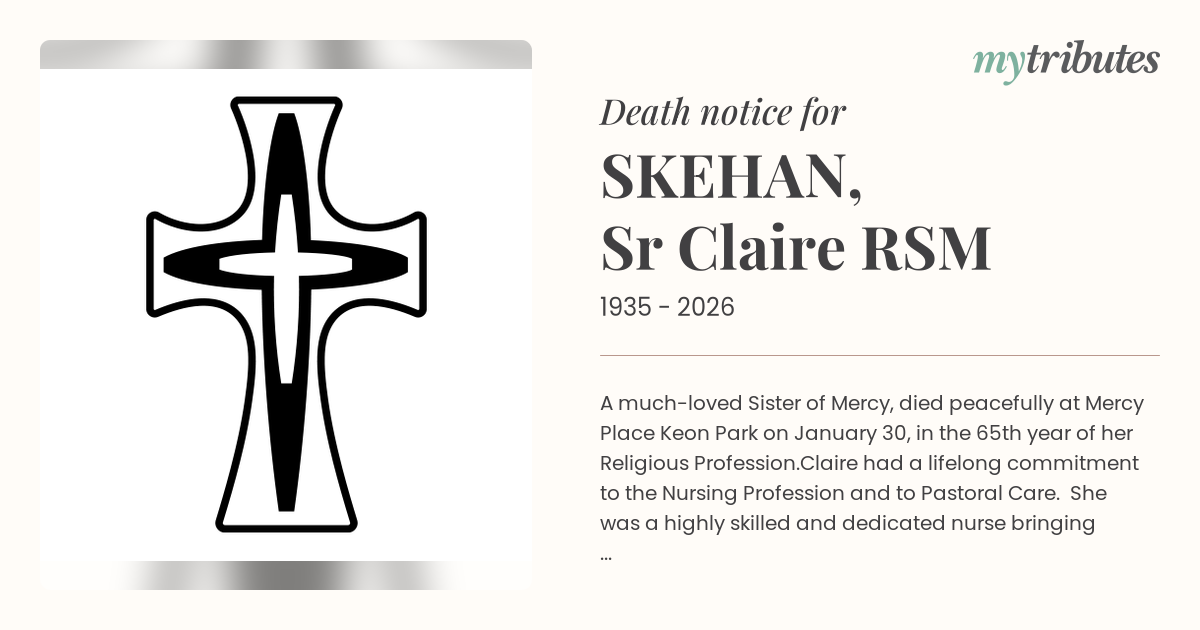 16°CA much-loved Sister of Mercy, died peacefully at Mercy Place Keon Park on January 30, in the 65th year of her Religious Profession.