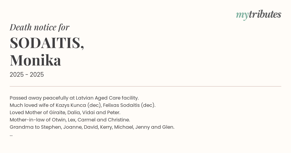 Much loved wife of Kazys Kunca (dec), Felixas Sodaitis (dec).