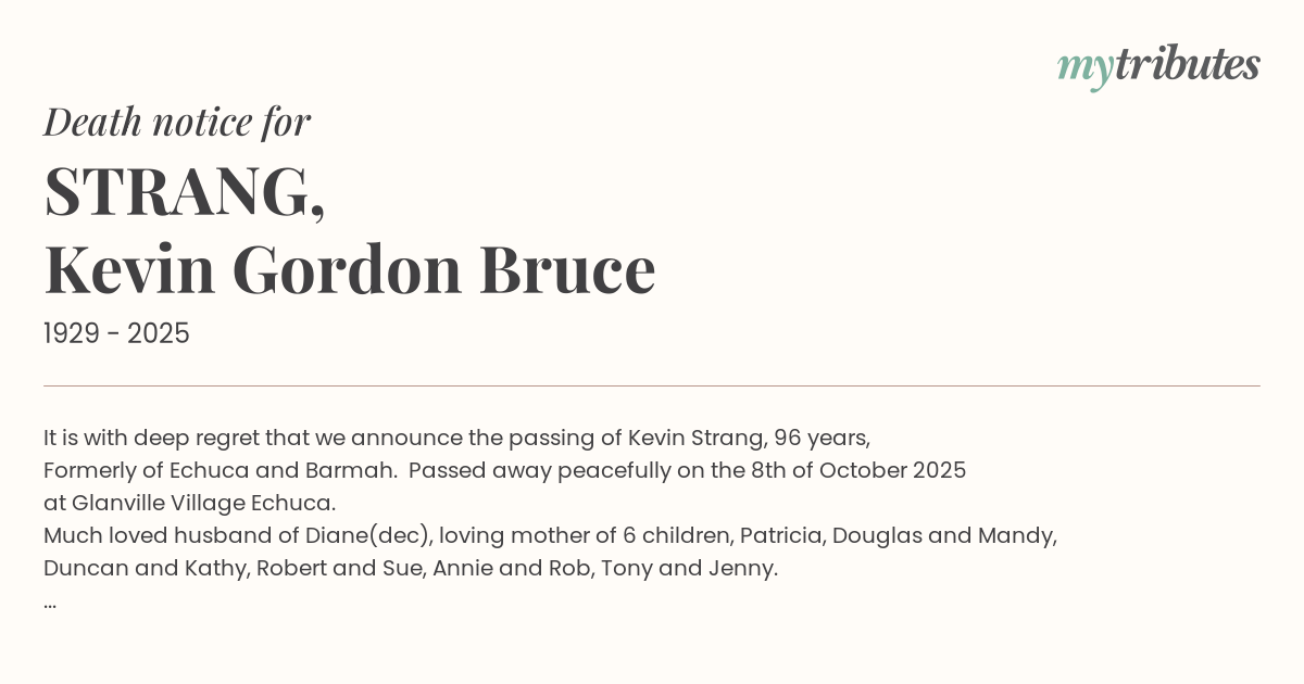 16°CIt is with deep regret that we announce the passing of Kevin Strang, 96 years,