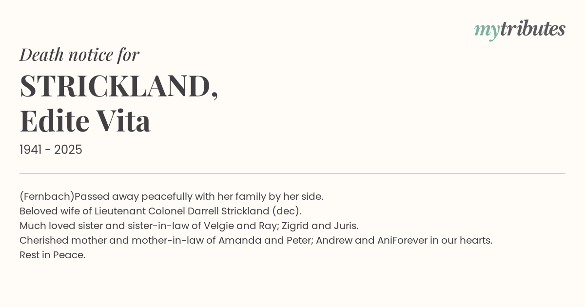 Passed away peacefully with her family by her side. Beloved wife of Lieutenant Colonel Darrell Strickland (dec). Much loved sister and sister-in-law of Velgie and Ray; Zigrid and Juris. Cherished mother and mother-in-law of Amanda and Peter; Andrew and Ani
