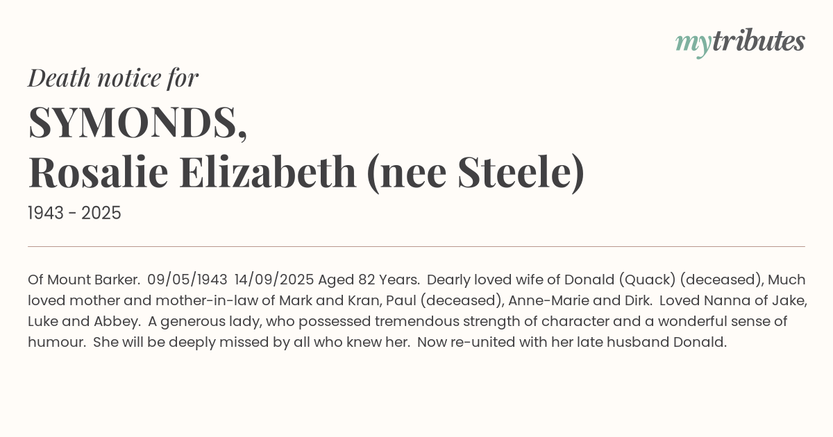 16°COf Mount Barker. 09/05/1943 – 14/09/2025 Aged 82 Years. Dearly loved wife of Donald (Quack) (deceased), Much loved mother and mother-in-law of Mark and Kran, Paul (deceased), Anne-Marie and Dirk. Loved Nanna of Jake, Luke and Abbey. A generous lady, who possessed tremendous strength of character and a wonderful sense of humour. She will be deeply missed by all who knew her. “Now re-united with her late husband Donald.”