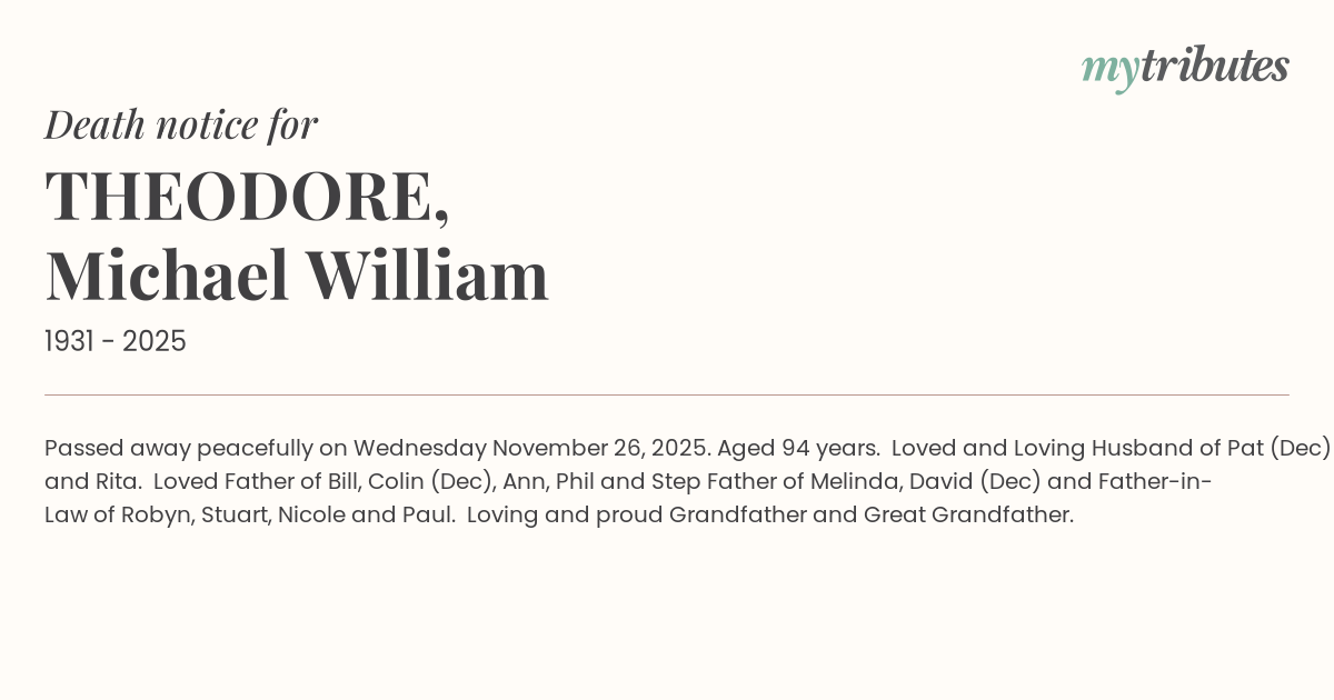 16°CPassed away peacefully on Wednesday November 26, 2025. Aged 94 years. Loved and Loving Husband of Pat (Dec) and Rita. Loved Father of Bill, Colin (Dec), Ann, Phil and Step Father of Melinda, David (Dec) and Father-in-Law of Robyn, Stuart, Nicole and Paul. Loving and proud Grandfather and Great Grandfather.