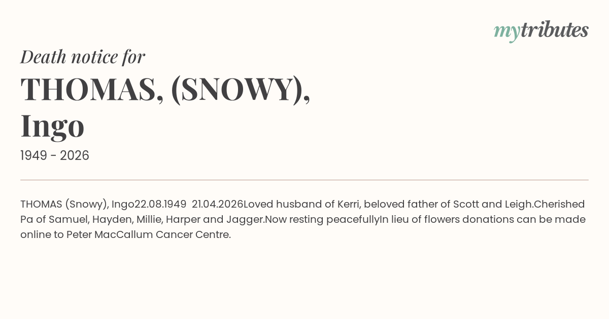 In lieu of flowers donations can be made online to Peter MacCallum Cancer Centre.