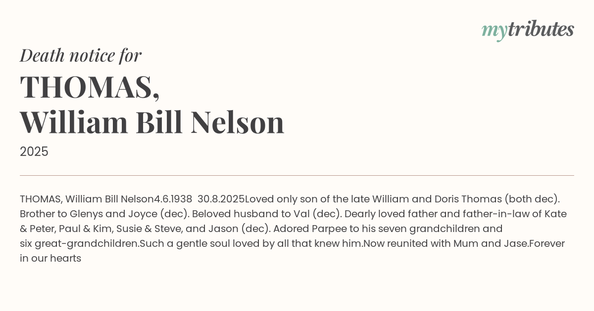 Loved only son of the late William and Doris Thomas (both dec). Brother to Glenys and Joyce (dec). Beloved husband to Val (dec). Dearly loved father and father-in-law of Kate & Peter, Paul & Kim, Susie & Steve, and Jason (dec). Adored Parpee to his seven grandchildren and six great-grandchildren.