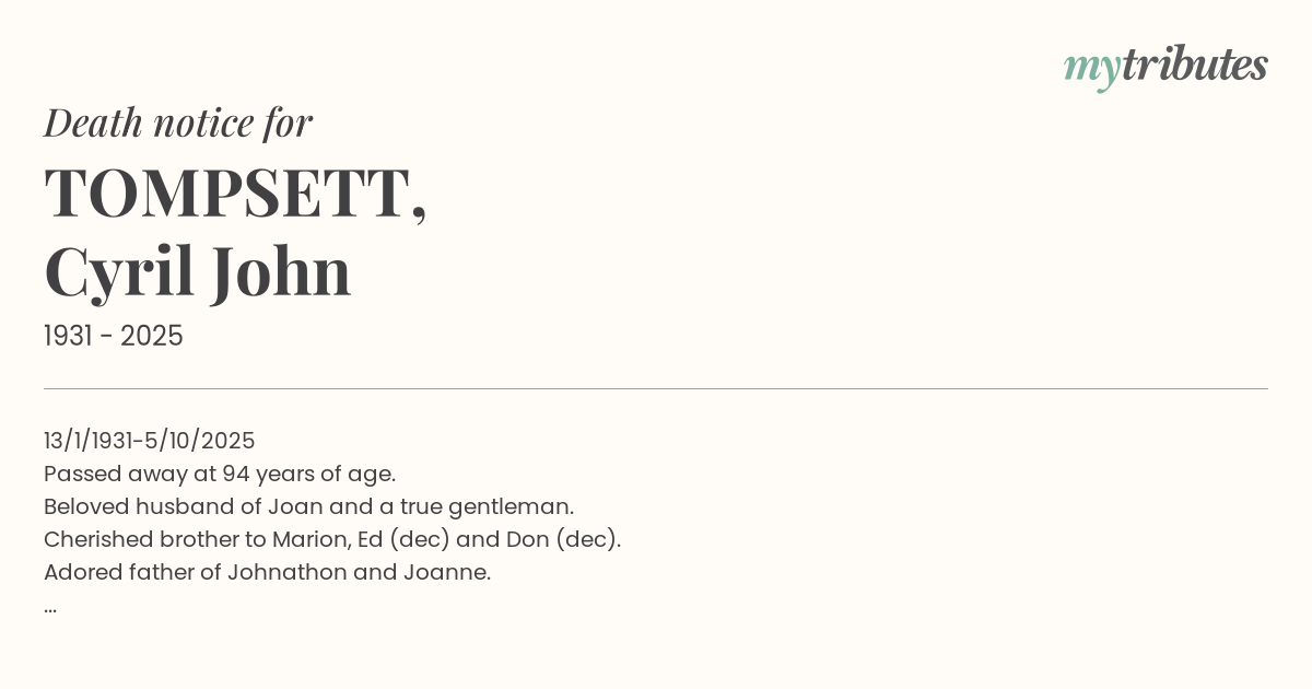 16°C13/1/1931-5/10/2025 Passed away at 94 years of age. Beloved husband of Joan and a true gentleman. Cherished brother to Marion, Ed (dec) and Don (dec). Adored father of Johnathon and Joanne. Loved Pa to Emily, Joshua, Daniel, Aston and Harley. Admired father-in-law to Leesa and Dirk.