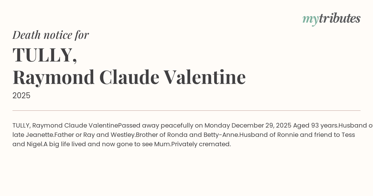 Passed away peacefully on Monday December 29, 2025 Aged 93 years.