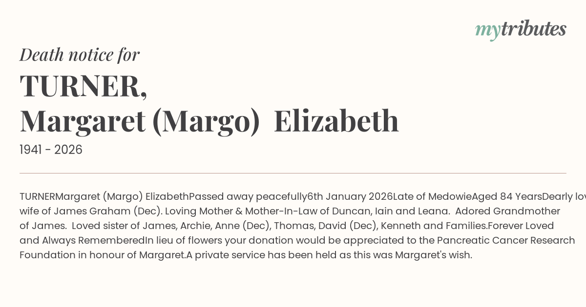 In lieu of flowers your donation would be appreciated to the Pancreatic Cancer Research Foundation in honour of Margaret.