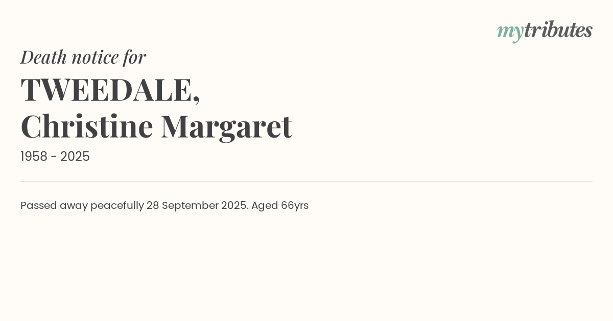 16°CPassed away peacefully 28 September 2025. Aged 66yrs