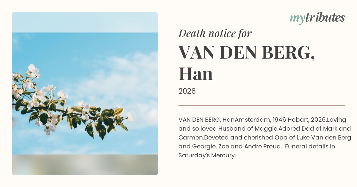 Devoted and cherished Opa of Luke Van den Berg and Georgie, Zoe and Andre Proud.