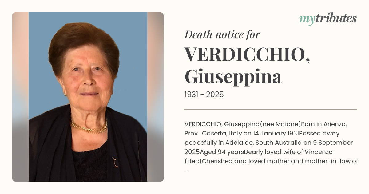 Proud, loved and adored Nonna of Anthony and Sonia, Michael and Nicola, Alessia, Julio, Natalia, Stefan and Bis-Nonna of Joseph, Alex, Hugo, Jack and Frankie
