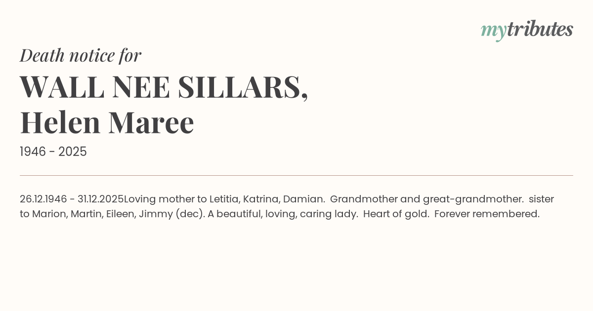 Loving mother to Letitia, Katrina, Damian. Grandmother and great-grandmother. sister to Marion, Martin, Eileen, Jimmy (dec). A beautiful, loving, caring lady. Heart of gold. Forever remembered.