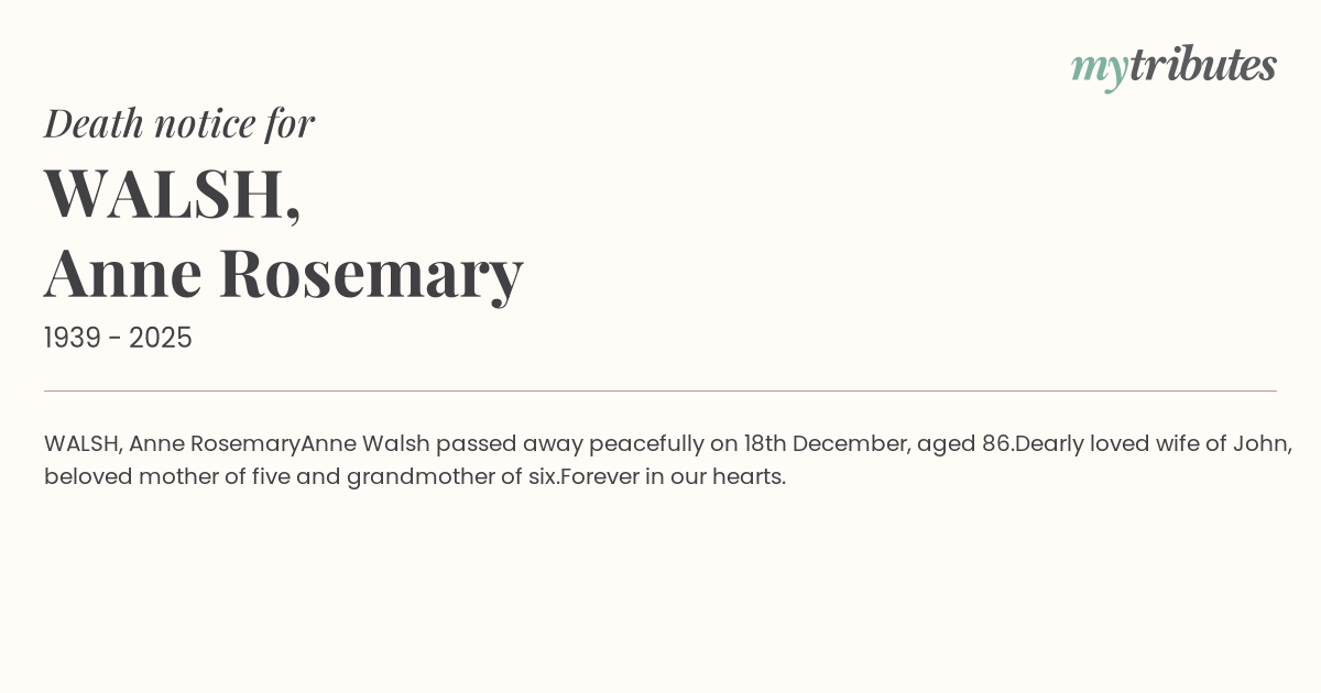 Anne Walsh passed away peacefully on 18th December, aged 86.