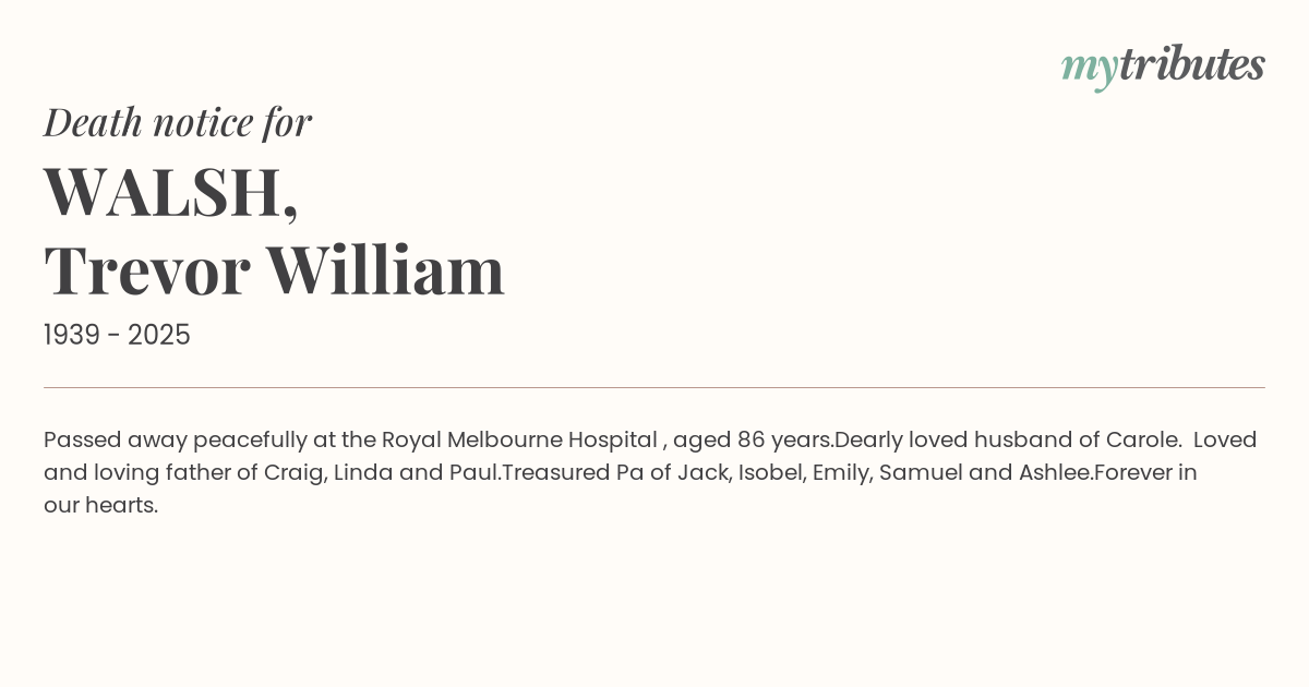 16°CPassed away peacefully at the Royal Melbourne Hospital , aged 86 years.