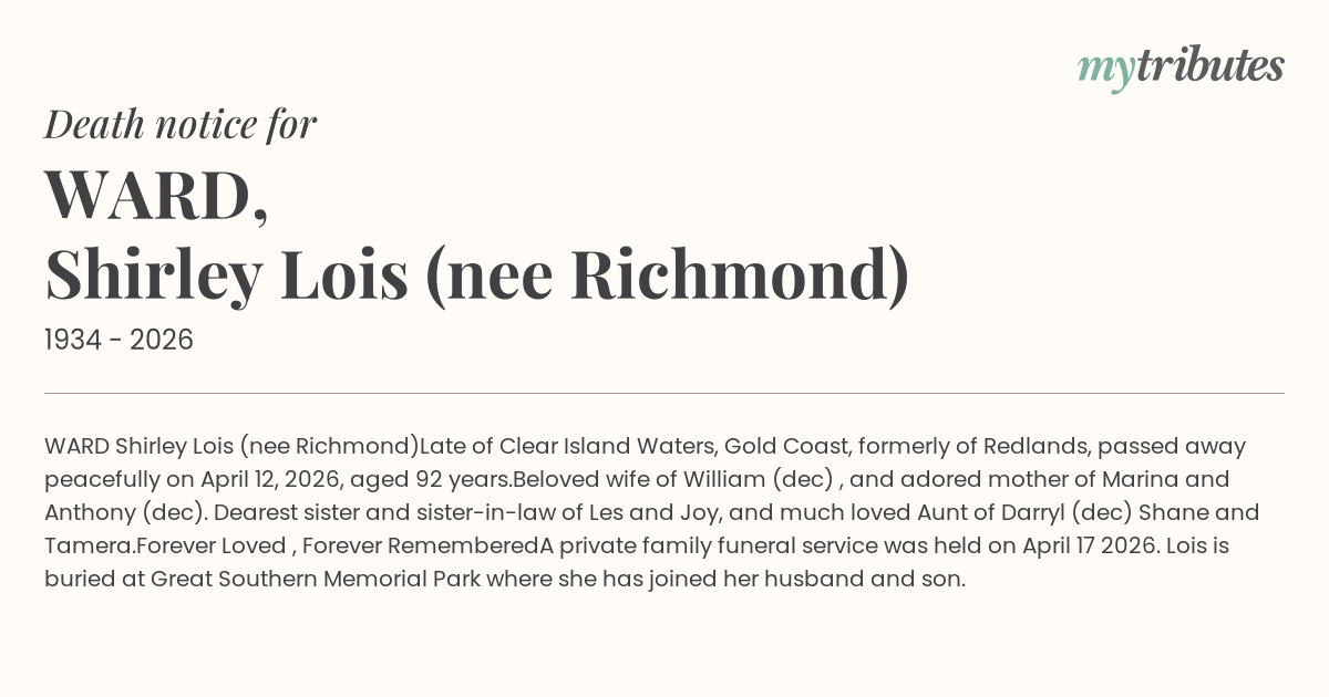 A private family funeral service was held on April 17 2026. Lois is buried at Great Southern Memorial Park where she has joined her husband and son.