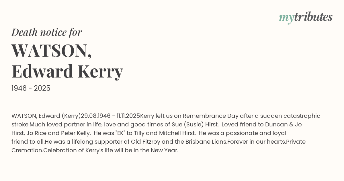 Much loved partner in life, love and good times of Sue (Susie) Hirst. Loved friend to Duncan & Jo Hirst, Jo Rice and Peter Kelly. He was "EK" to Tilly and Mitchell Hirst. He was a passionate and loyal friend to all.