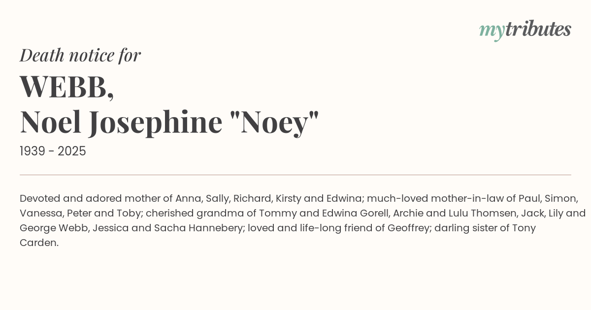 16°CDevoted and adored mother of Anna, Sally, Richard, Kirsty and Edwina; much-loved mother-in-law of Paul, Simon, Vanessa, Peter and Toby; cherished grandma of Tommy and Edwina Gorell, Archie and Lulu Thomsen, Jack, Lily and George Webb, Jessica and Sacha Hannebery; loved and life-long friend of Geoffrey; darling sister of Tony Carden.