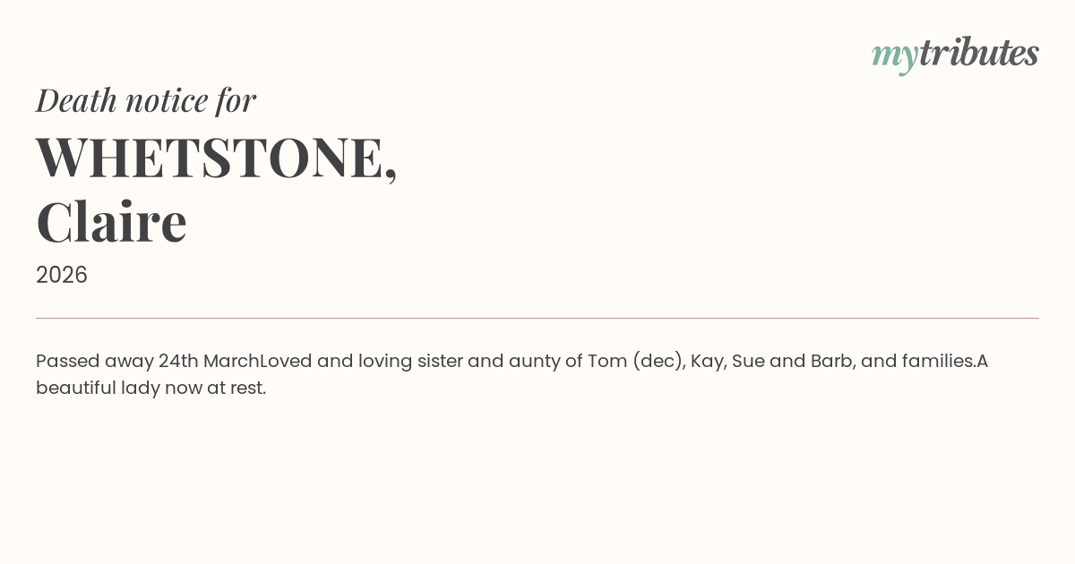 Loved and loving sister and aunty of Tom (dec), Kay, Sue and Barb, and families.