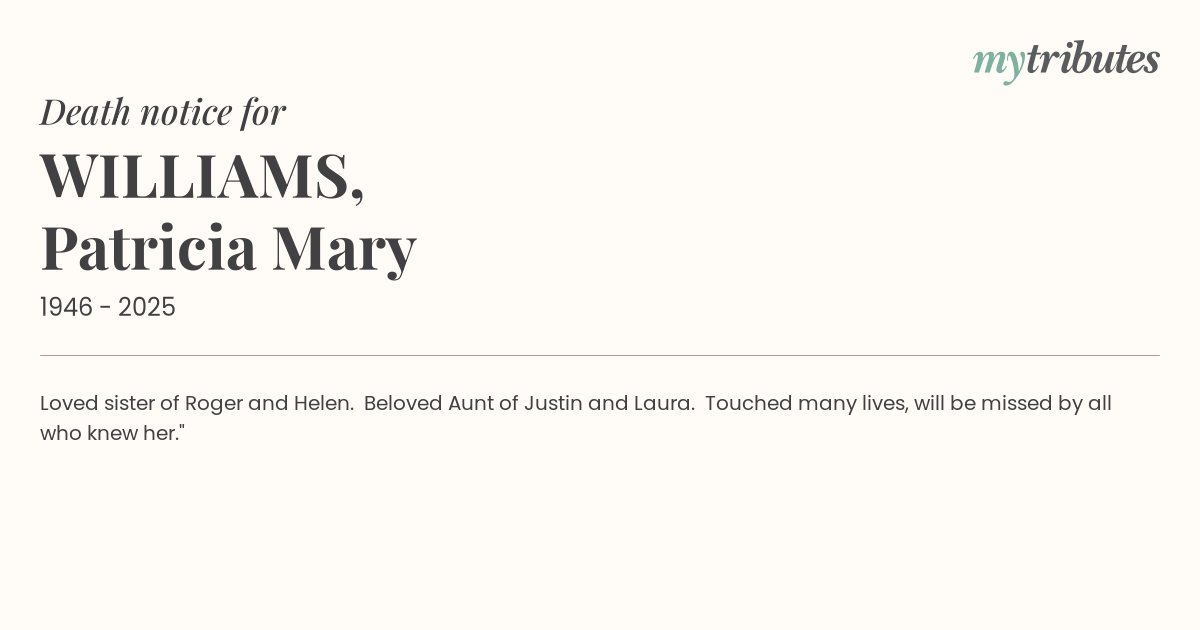 16°CLoved sister of Roger and Helen. Beloved Aunt of Justin and Laura. “Touched many lives, will be missed by all who knew her."