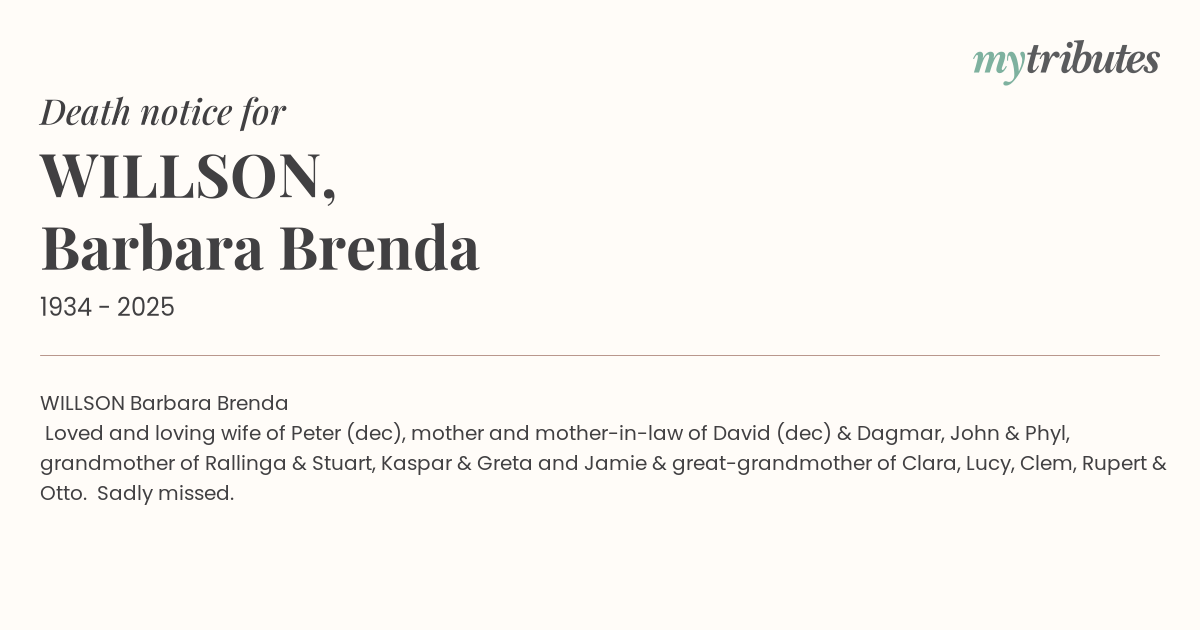 Loved and loving wife of Peter (dec), mother and mother-in-law of David (dec) & Dagmar, John & Phyl, grandmother of Rallinga & Stuart, Kaspar & Greta and Jamie & great-grandmother of Clara, Lucy, Clem, Rupert & Otto. Sadly missed.