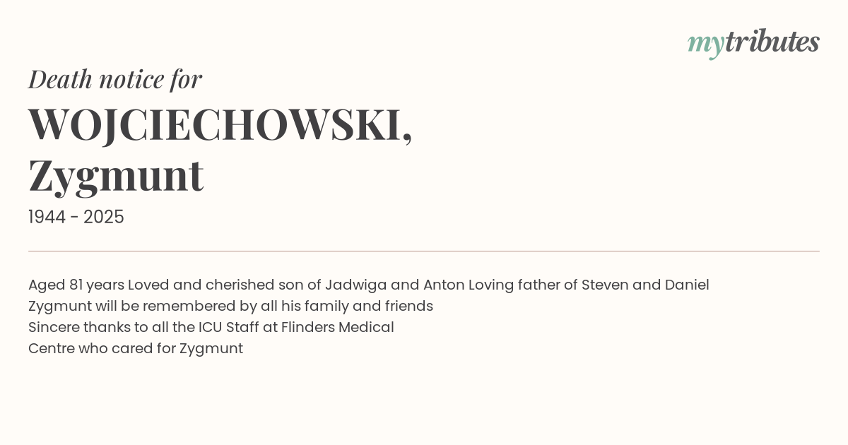 16°CAged 81 years Loved and cherished son of Jadwiga and Anton Loving father of Steven and Daniel