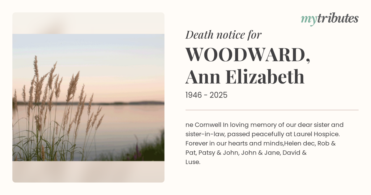 In loving memory of our dear sister and sister-in-law, passed peacefully at Laurel Hospice. Forever in our hearts and minds,