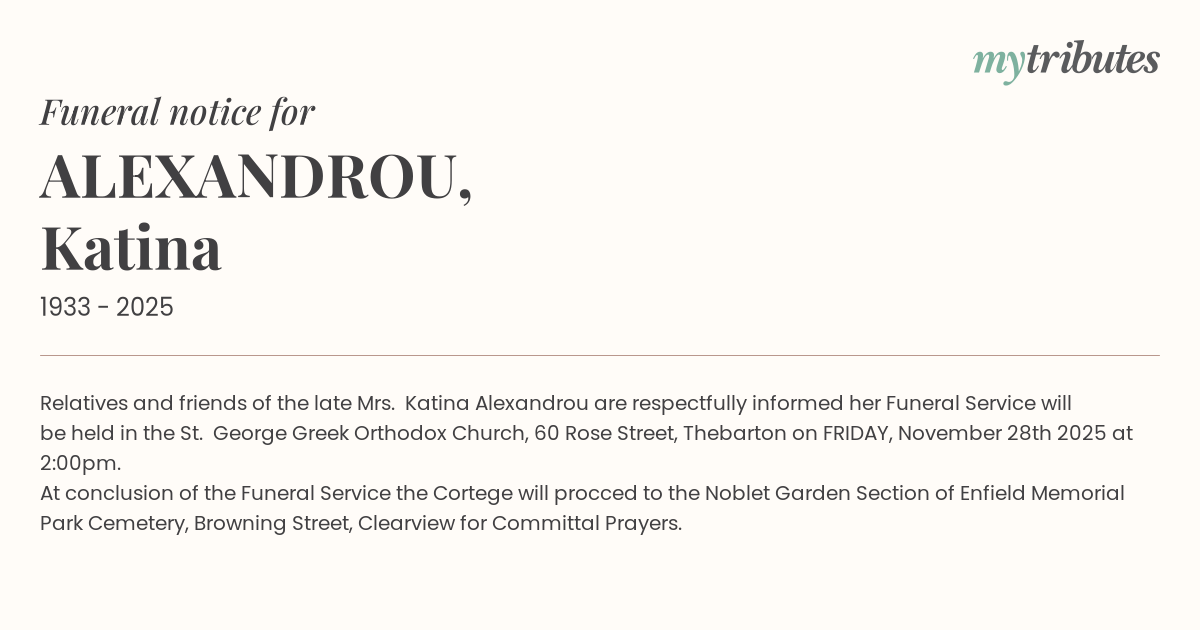 16°CRelatives and friends of the late Mrs. Katina Alexandrou are respectfully informed her Funeral Service will be held in the St. George Greek Orthodox Church, 60 Rose Street, Thebarton on FRIDAY, November 28th 2025 at 2:00pm.