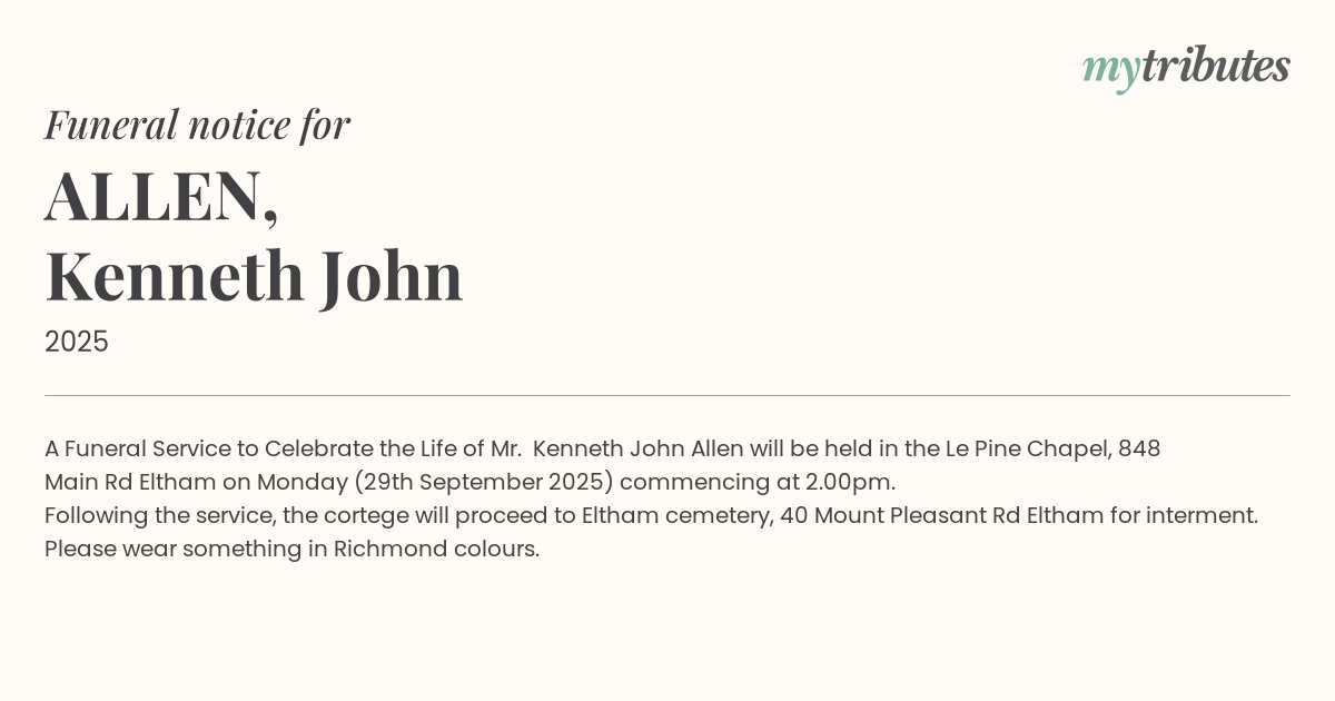 16°CA Funeral Service to Celebrate the Life of Mr. Kenneth John Allen will be held in the Le Pine Chapel, 848 Main Rd Eltham on Monday (29th September 2025) commencing at 2.00pm.