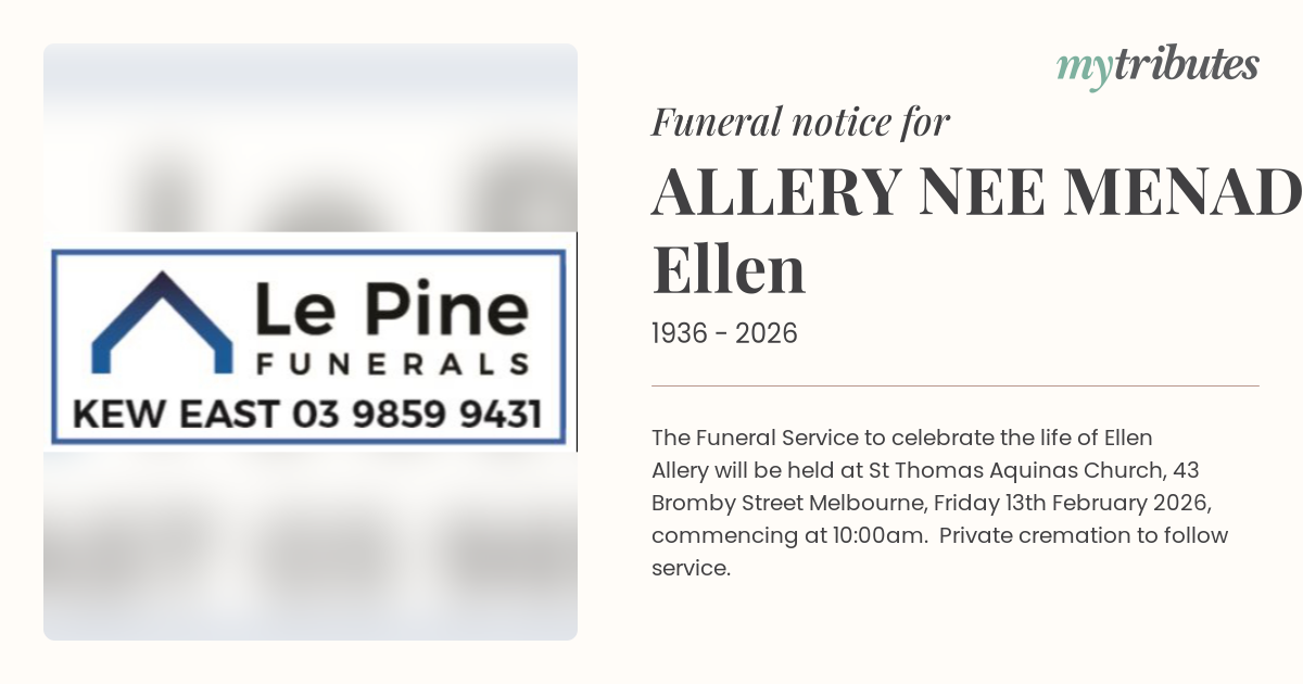 16°CThe Funeral Service to celebrate the life of Ellen Allery will be held at St Thomas Aquinas Church, 43 Bromby Street Melbourne, Friday 13th February 2026, commencing at 10:00am.