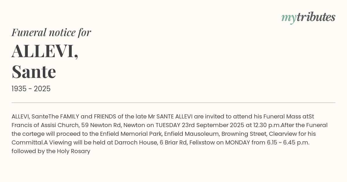 The FAMILY and FRIENDS of the late Mr SANTE ALLEVI are invited to attend his Funeral Mass at