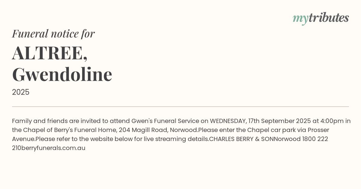 16°CFamily and friends are invited to attend Gwen's Funeral Service on WEDNESDAY, 17th September 2025 at 4:00pm in the Chapel of Berry's Funeral Home, 204 Magill Road, Norwood.