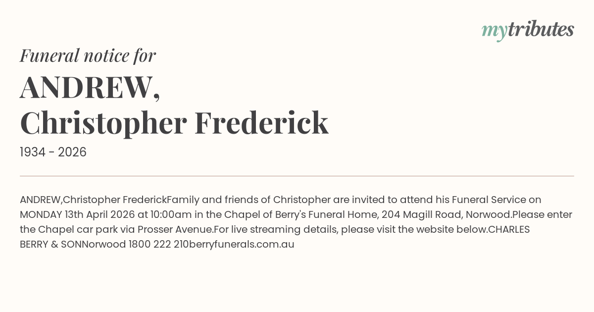 Family and friends of Christopher are invited to attend his Funeral Service on MONDAY 13th April 2026 at 10:00am in the Chapel of Berry's Funeral Home, 204 Magill Road, Norwood.