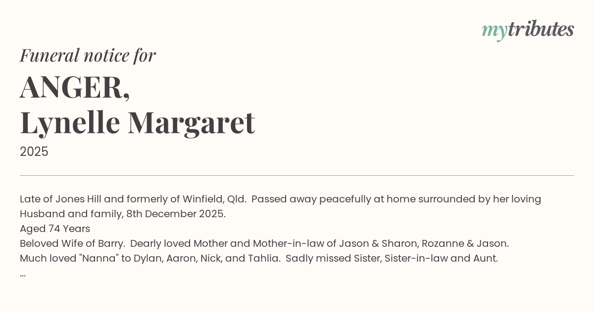 Relatives and friends of Lynelle, Barry and family are respectfully invited to attend a Celebration of Lynelle's Life is to be held in the Cooloola Coast Crematorium Chapel, 236 Brisbane Road, Gympie on Friday, 19th December 2025 commencing at 11.00am